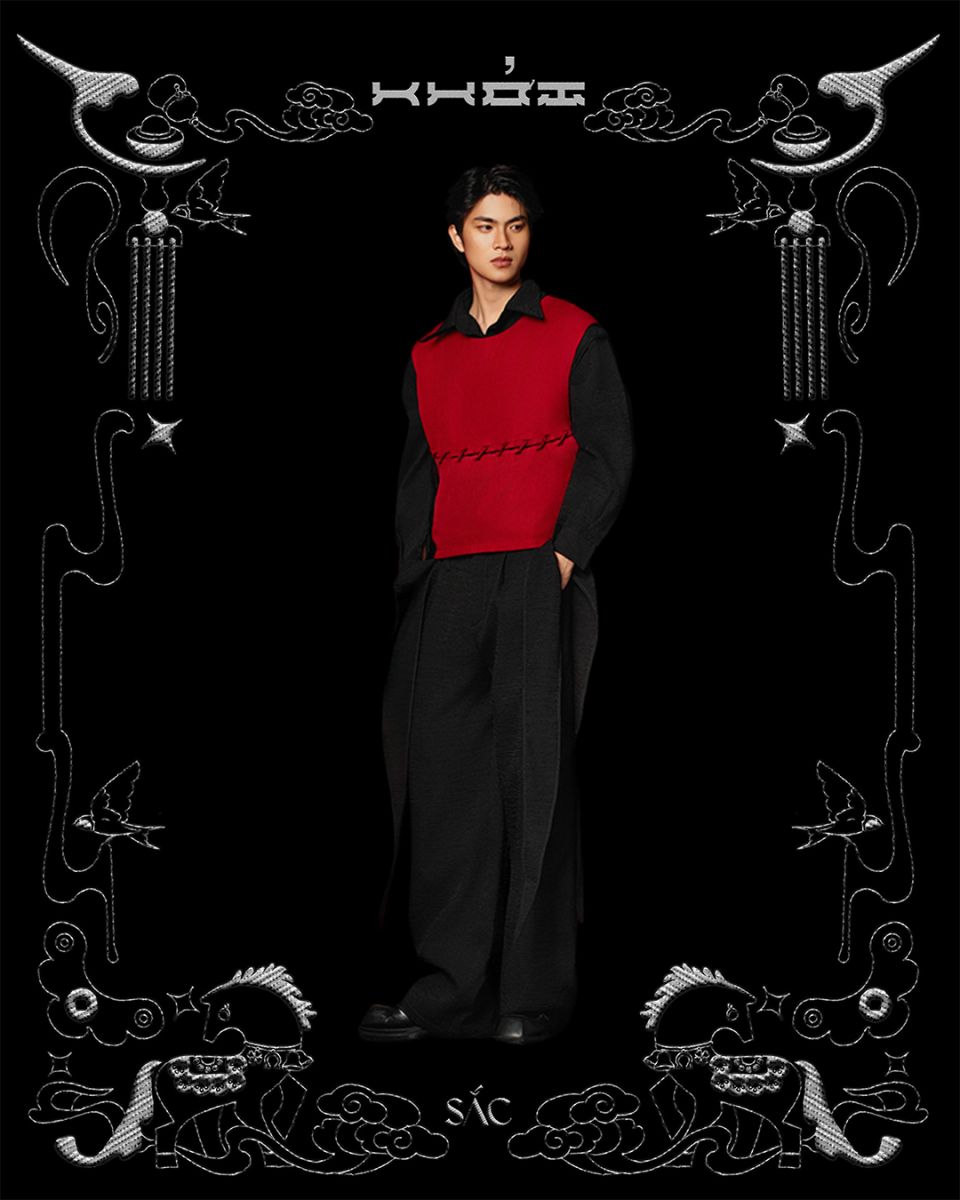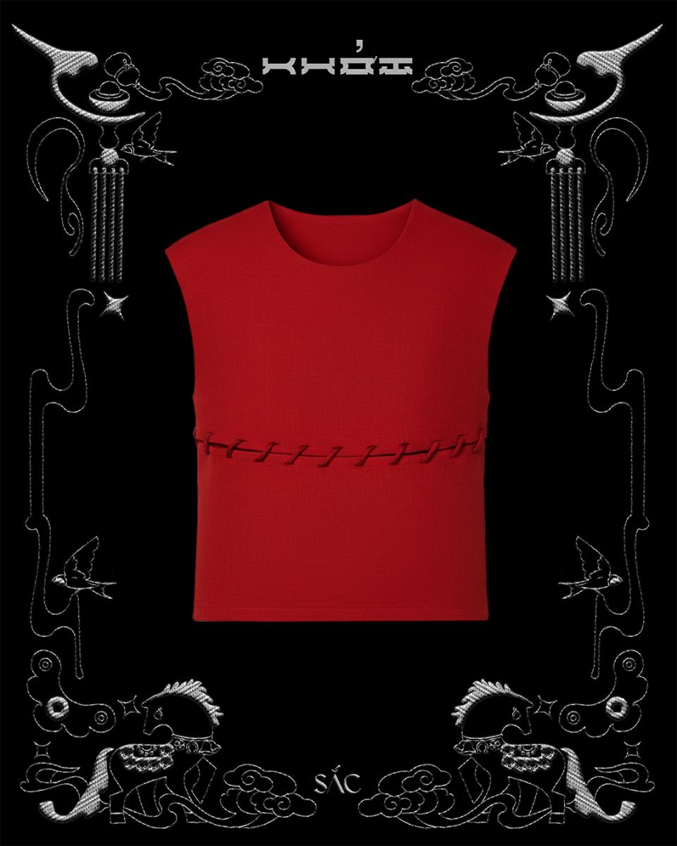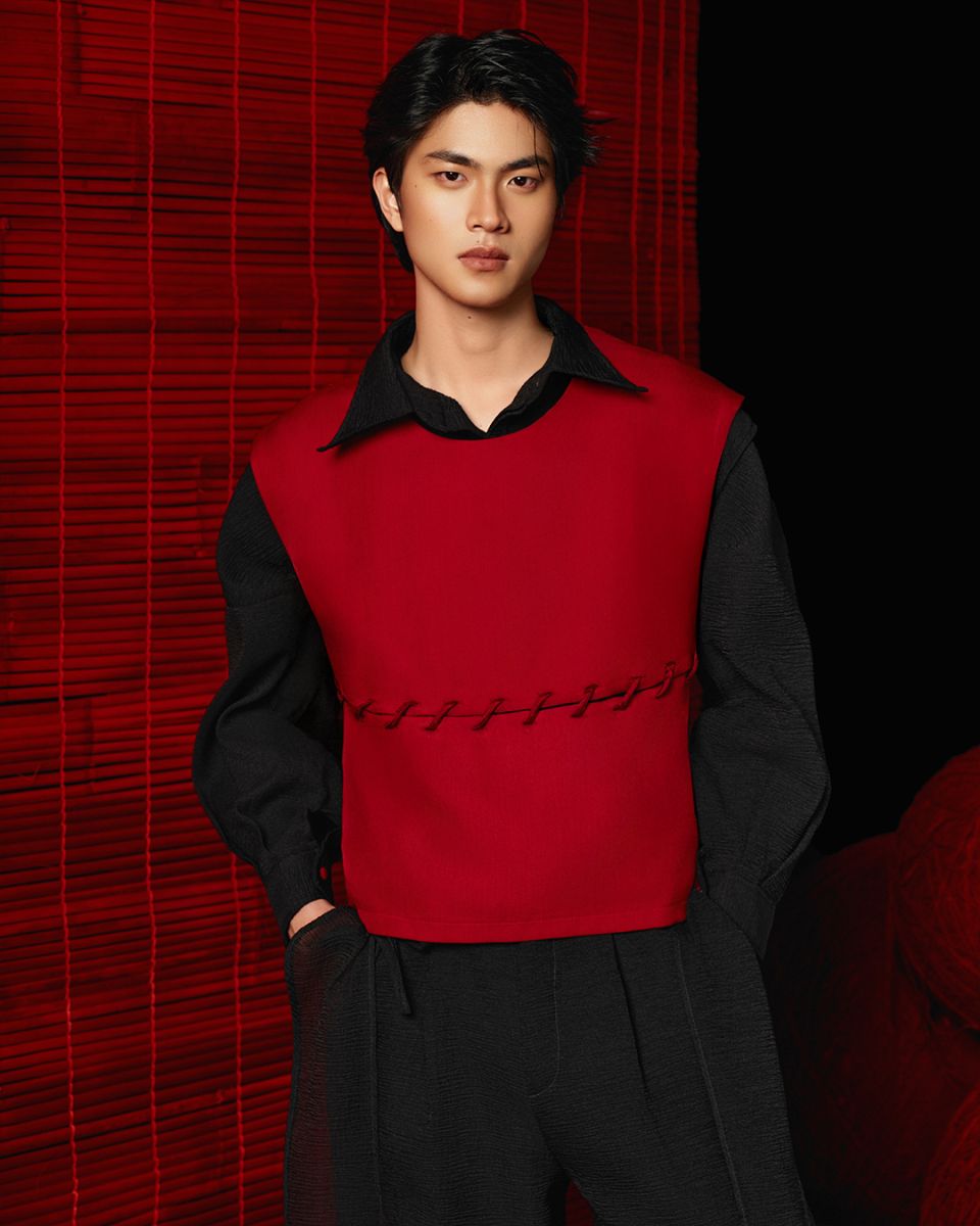 • The "Bén" vest features a streamlined silhouette in a structured, ribbed twill fabric, creating a sense of solidity and clarity. The waist tie detail becomes a decisive focal point, highlighting the overall "Bén" spirit.